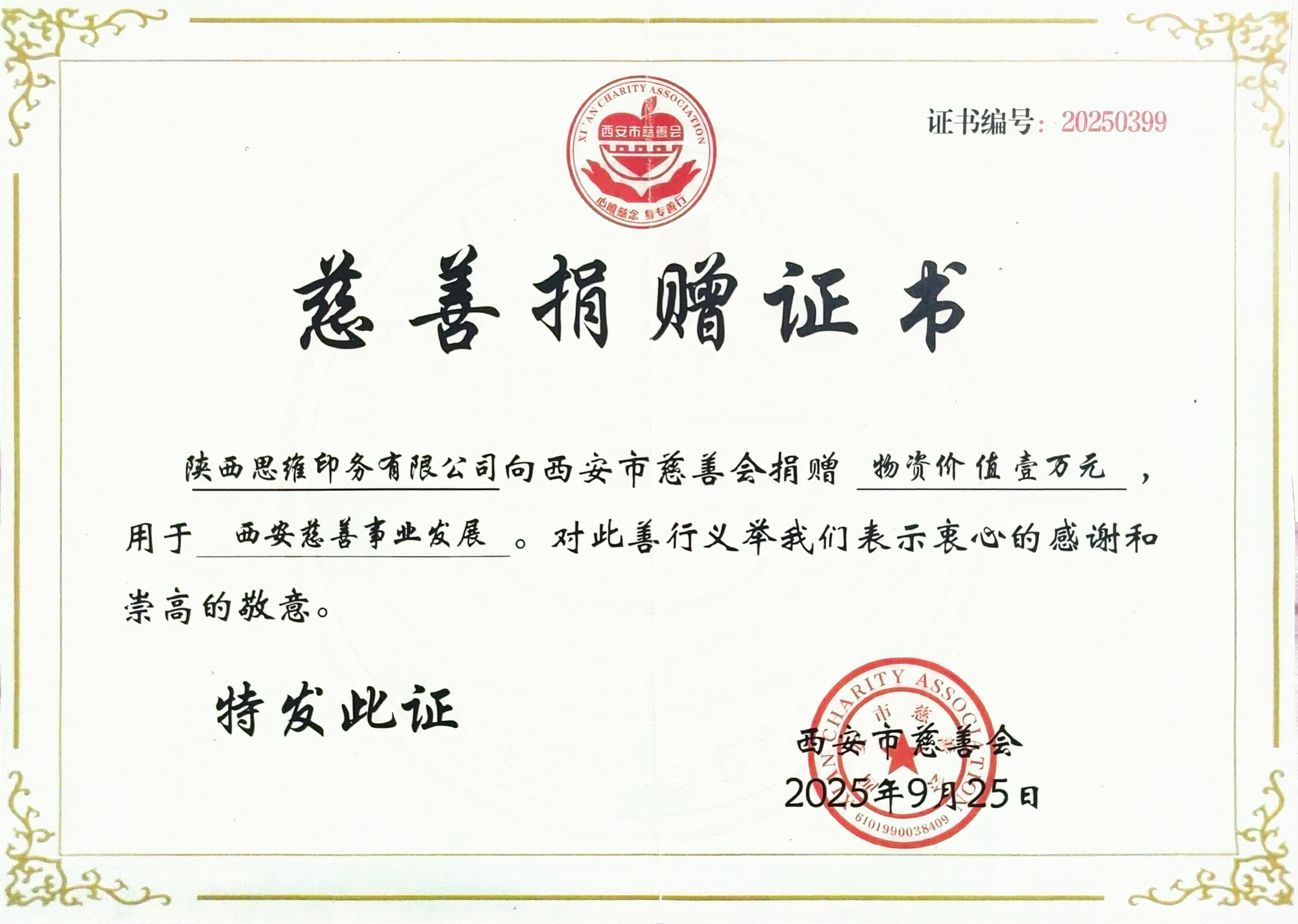 In the golden autumn of September, we ushered in the tenth "China Charity Day". Shaanxi Siwei Printing Co., Ltd. donated materials worth ten thousand yuan to the Xi'an Charity Federation to support the development of Xi'an charity. Shaanxi Siwei Printing Co., Ltd. has always adhered to the concept of giving back to society, actively participated in various public welfare activities, and called on all sectors of society to jointly devote themselves to charity and comprehensively promote the development of public welfare undertakings.